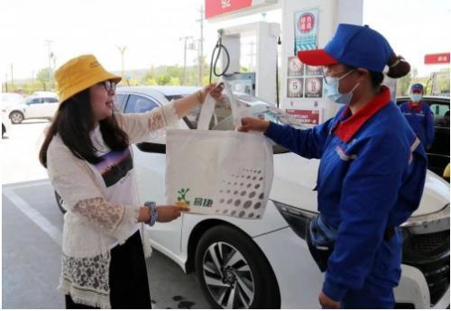 圖為中國石化青海石油分公司的加油站員工向客戶贈送環(huán)保購物袋